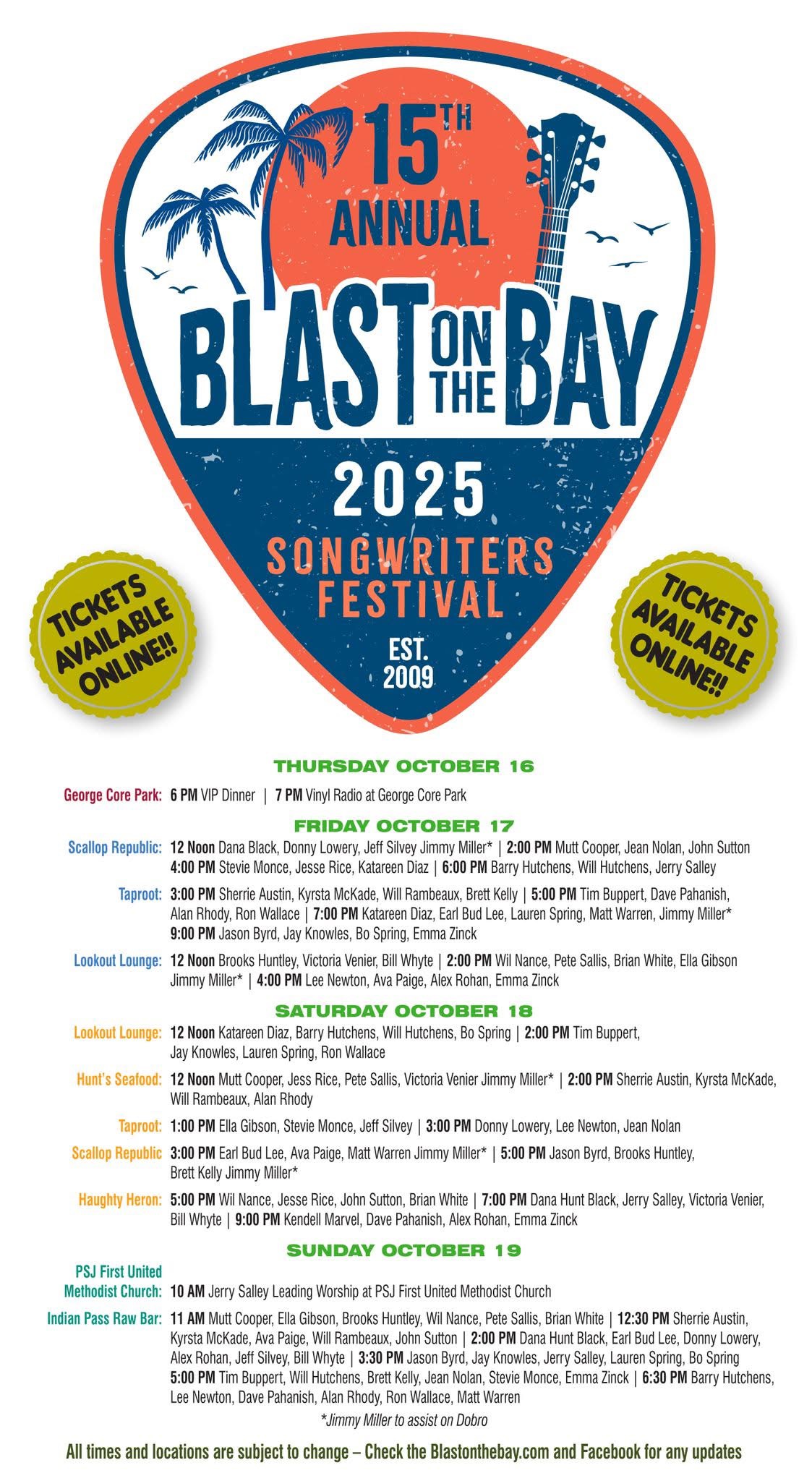 Sunday, October 19 wraps up the weekend with a soulful service at PSJ First United Methodist Church, followed by all-day performances at Indian Pass Raw Bar. For the full schedule, visit the official site at BlastOnTheBay.com