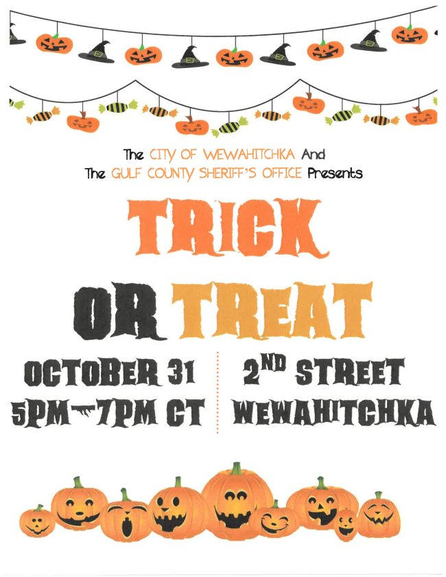 Join the Gulf County Sheriff’s Office for a safe, festive night of candy and costumes in downtown Wewa.